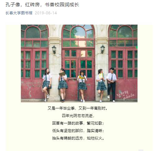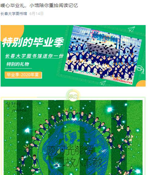 每年的毕业季微信公众号都会推出一系列线上线下的活动,以及图书馆送给毕业生的寄语和毕业留念。