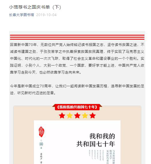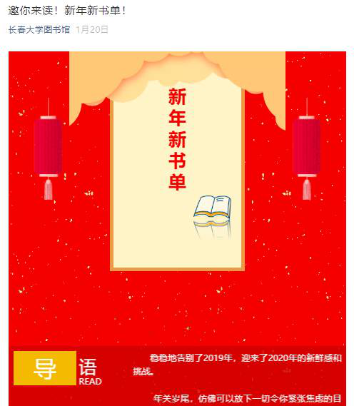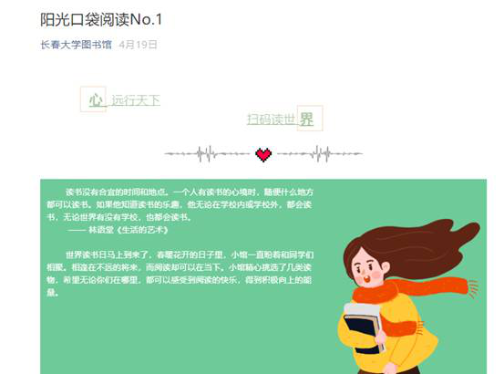 在过去的2019年里,我馆的新媒体阅读推广模式取得了很大的进步,尤其是微信公众号线上线下的阅读推广活动,吸引了更多读者积极参与其中,使得阅读推广的效果明显增强。目前我馆的微信公众号总用户为10977人,并集成了汇文管理系统,在线新生入馆教育和长春大学图书馆空间管理系统等服务;经过一段时间的摸索,逐渐形成了适合我校读者需求,有自己特色的阅读推广系列,如: