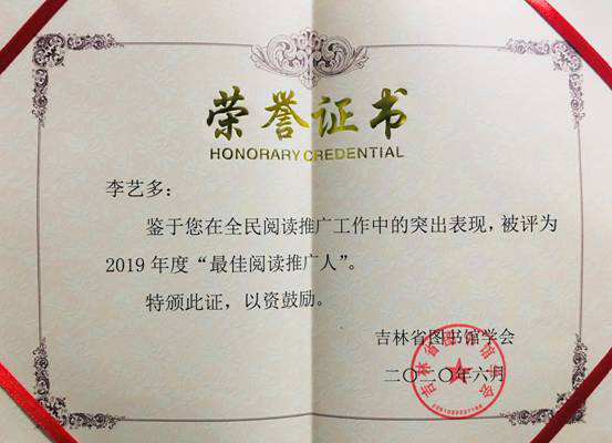 我馆李艺多老师被评为2019年度“最佳阅读推广人”。