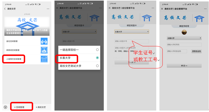 2.打开入馆预约空间管理,选择院校“长春大学”。填写校园卡号,学生填写学生证号,教工为工号。提交后需要输入手机号,并获取验证码进行验证。