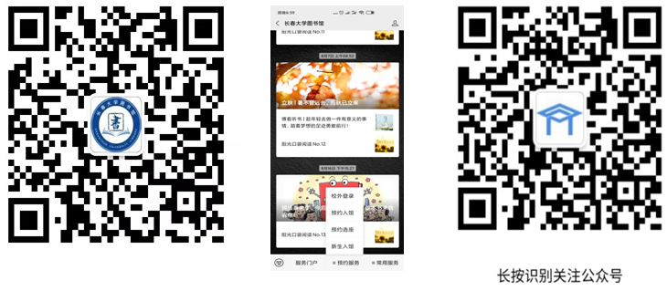 1.关注“长春大学图书馆”公众号。打开预约服务,点击预约入馆。识别二维码关注“高校文芒”公众号。
