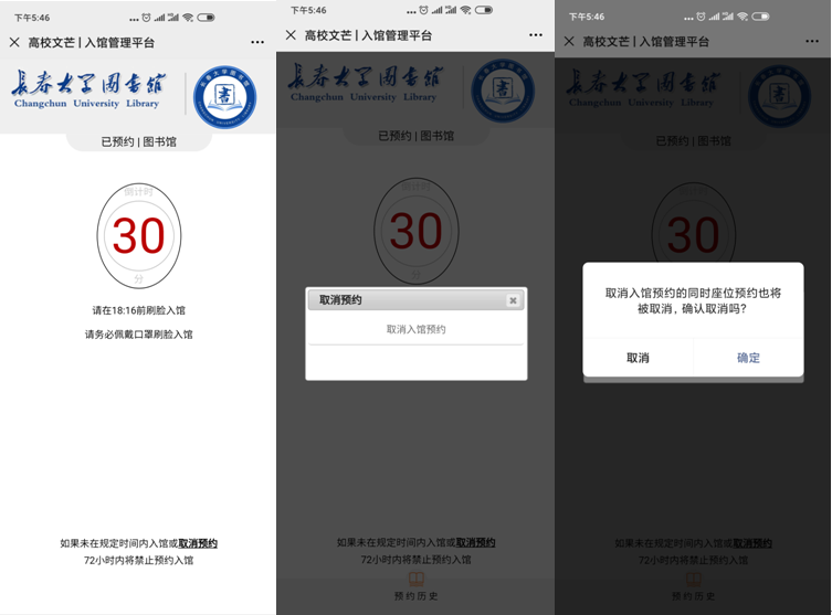 3.预约入馆成功后,请在规定时间内入馆或取消预约,否则视为违规。取消预约方式如下。