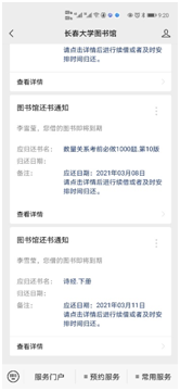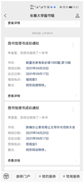 1.读者成功绑定微信公众号后,外网也可接收到“借还书信息”、“还书提醒”。