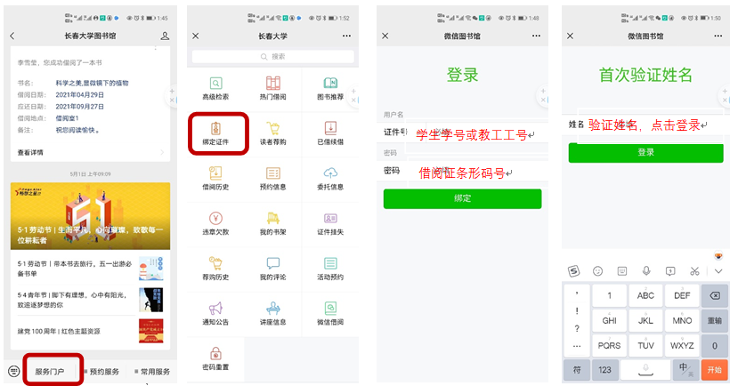 关注长春大学图书馆微信公众号,点击下方服务门户,进行借阅证绑定。