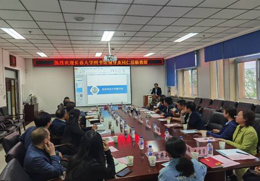 首先,两馆成员开展了座谈交流。唐武生馆长从图书馆的馆舍情况、人员组织结构、空间改造及馆藏资源利用、学科及特色服务几个方面进行了介绍。刘占柱馆长通过播放宣传片及PPT宣讲的方式,从以下三方面着重介绍了吉林农业大学图书馆:一、图书馆各部门的工作职责;二、旧馆改造情况,包括制度建设、房间调整改造、读者秩序治理、阅览环境改造;三、资源建设及学科、读者服务保障制度。
